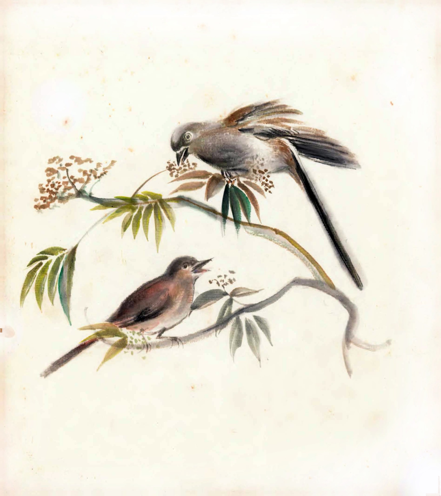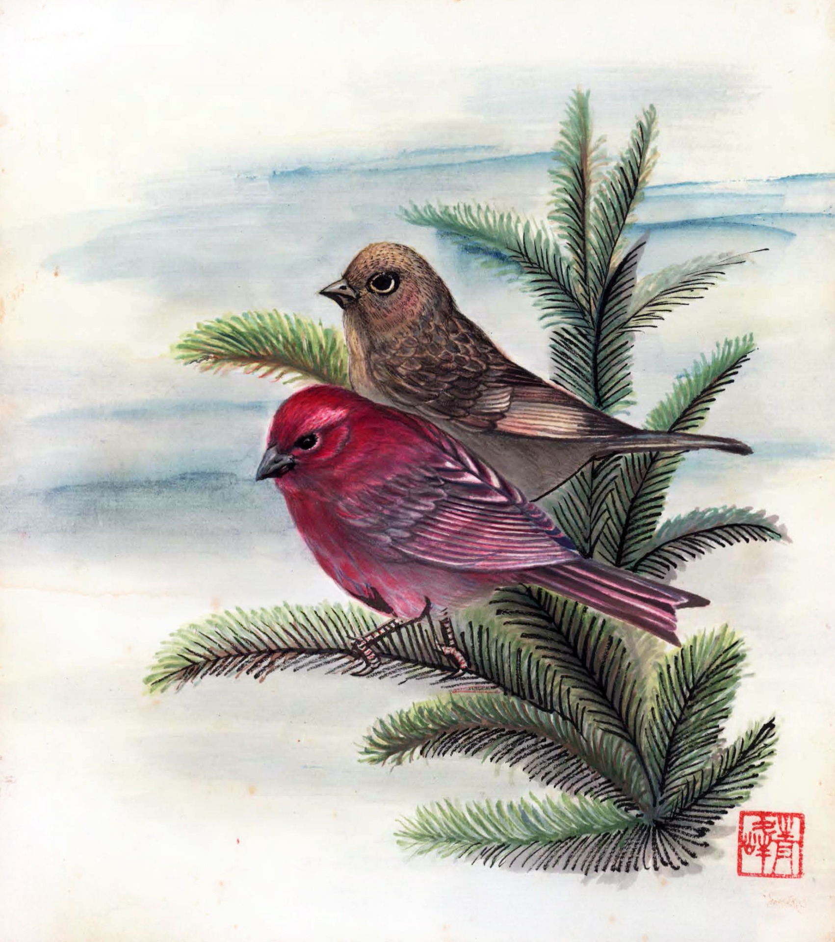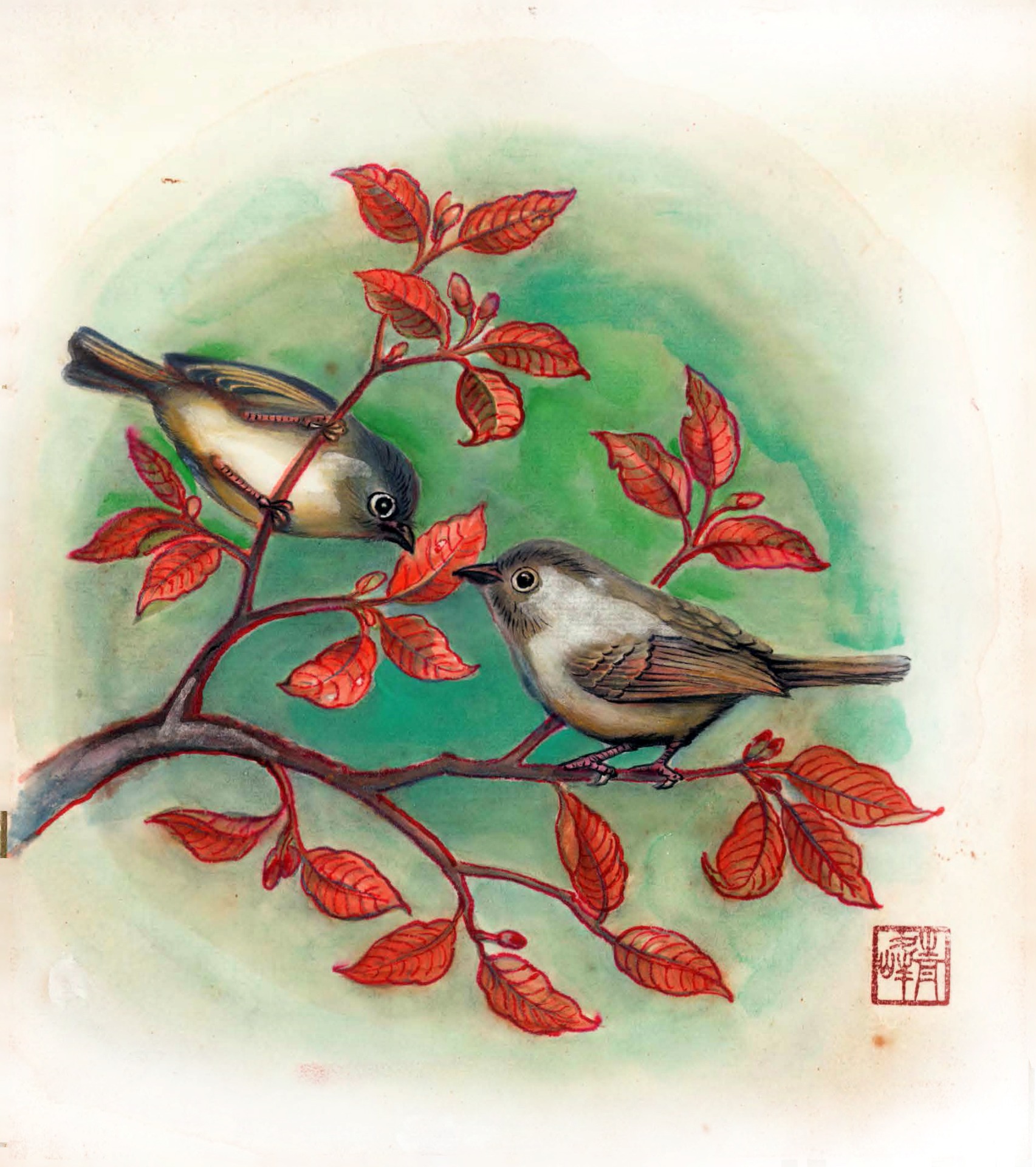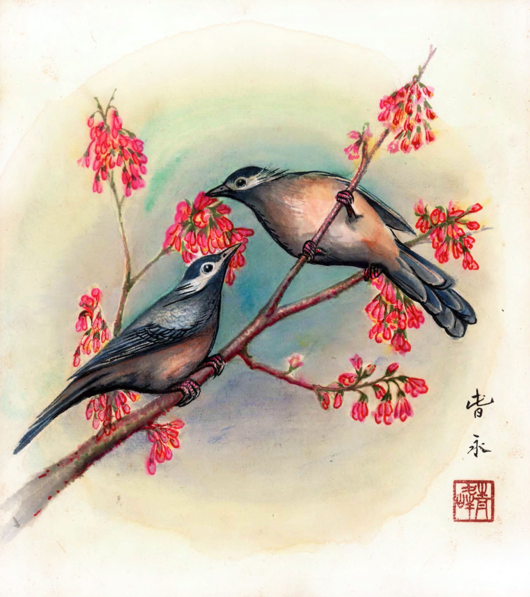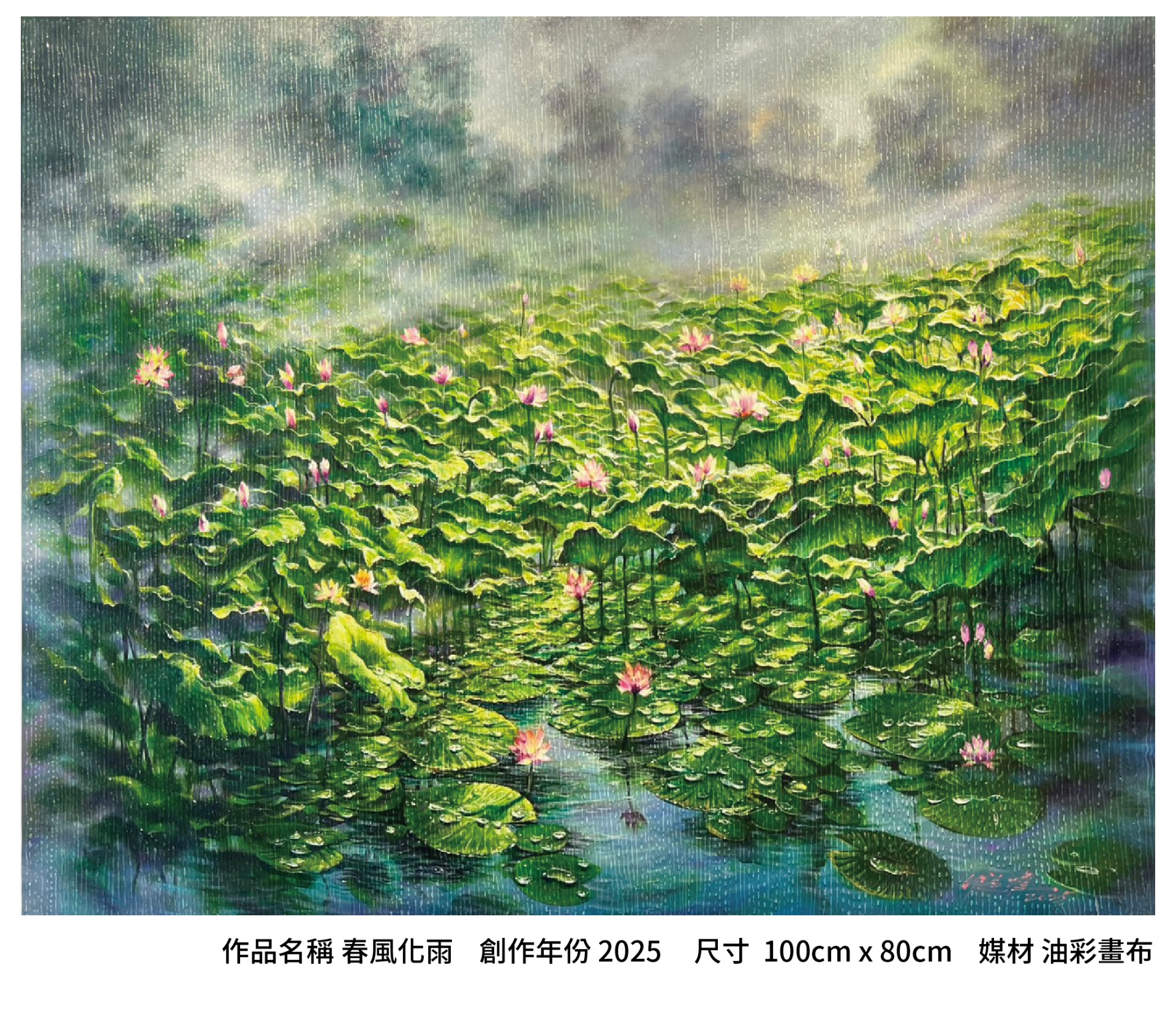 這幅作品描繪一片盛開於春雨中的蓮花池,濛濛細雨下,綠意蔓延、花朵悄然綻放。