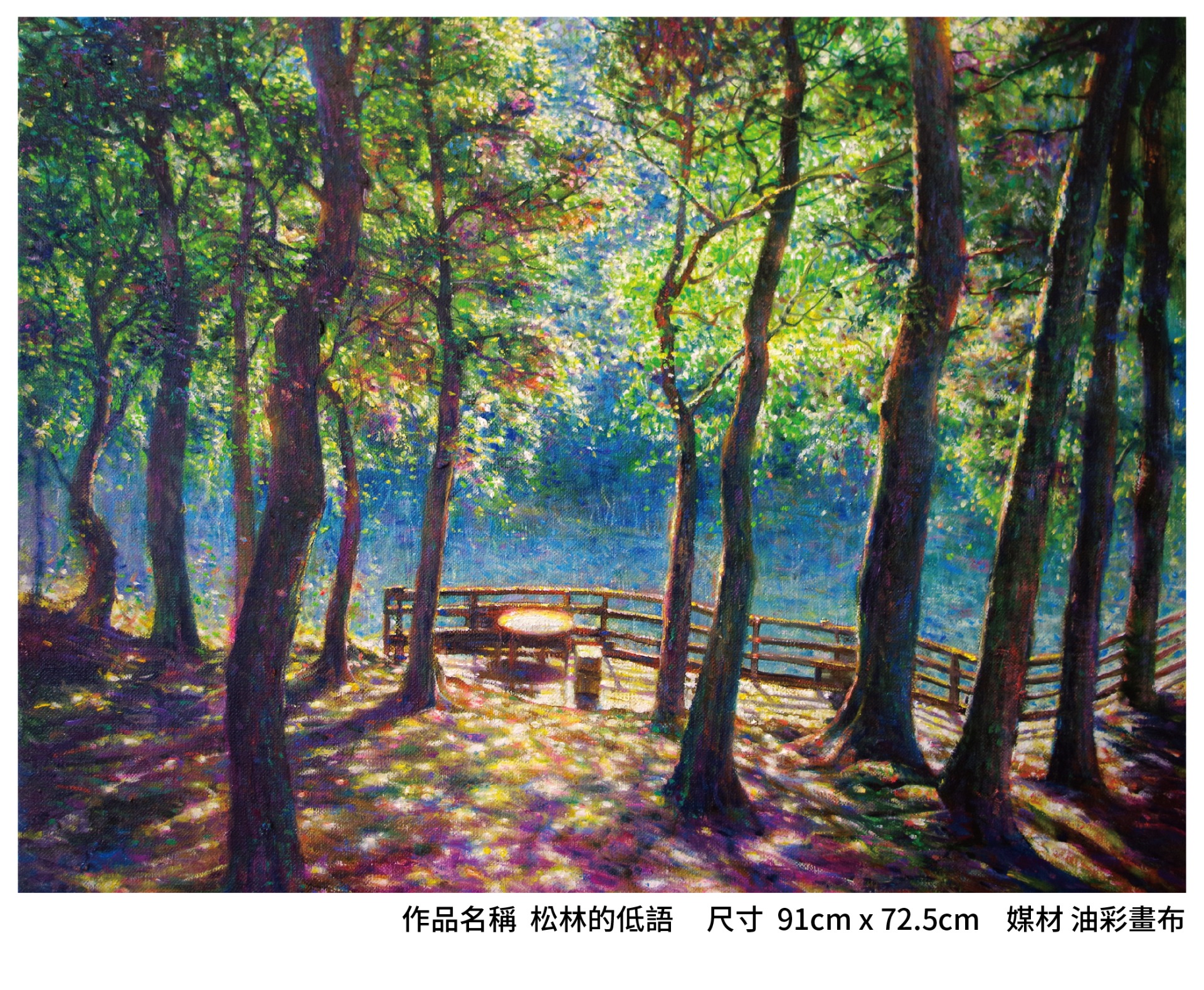 捕捉午後陽光穿透林梢、灑落林地的瞬間,以油畫堆疊層層色彩與筆觸,在光與影的交會中創造出如夢似幻的視覺詩意。