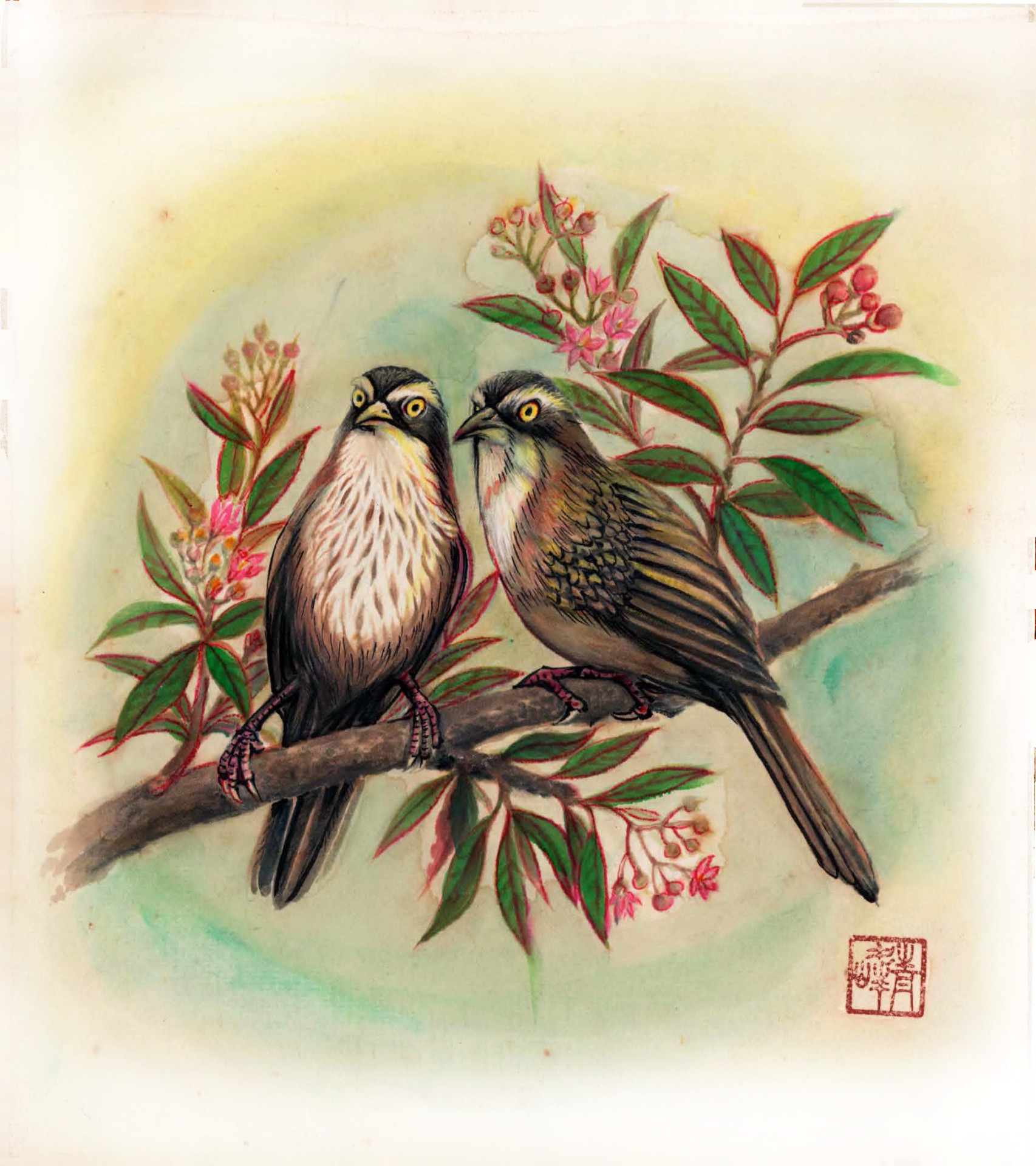 這幅作品描繪一片盛開於春雨中的蓮花池,濛濛細雨下,綠意蔓延、花朵悄然綻放。